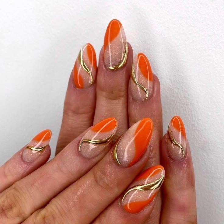 This design blends bright orange with sheer nude bases and flowing gold accents for a sleek, modern look. The mix of glossy color and metallic lines gives it a bold yet elegant summer vibe.