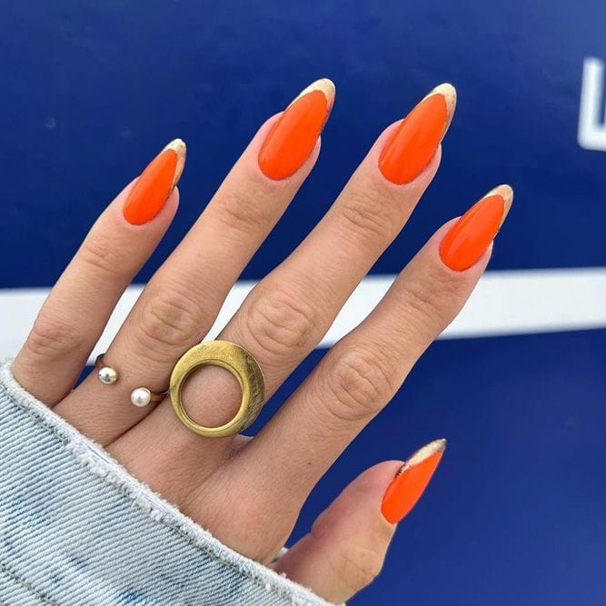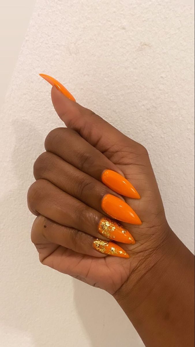 Bright orange stiletto nails are paired with a sparkling gold-glitter accent for extra drama. The style feels bold, glamorous, and made to stand out in the summer sun.