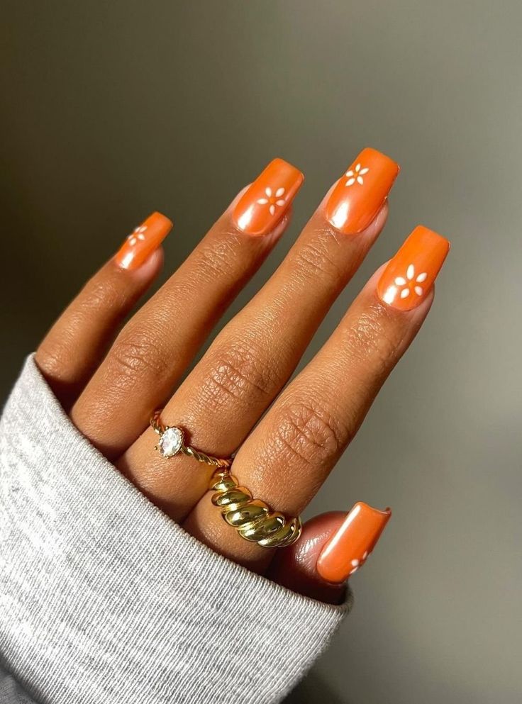 Glossy orange nails are topped with tiny white floral details for a sweet, retro touch. The look is simple, cheerful, and perfect for a fun summer statement.