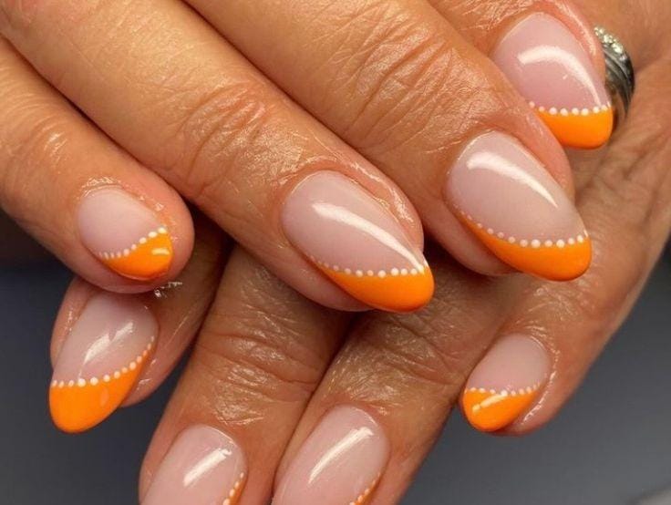 A nude base blends into vibrant orange tips lined with delicate white dots for a modern twist on the classic French. It feels clean, bright, and effortlessly chic.