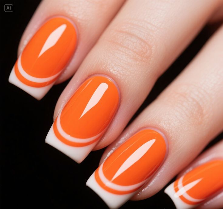 Bold orange nails are finished with crisp white curved lines along the tips for a graphic, sporty feel. The glossy finish keeps the look sleek and eye-catching.
