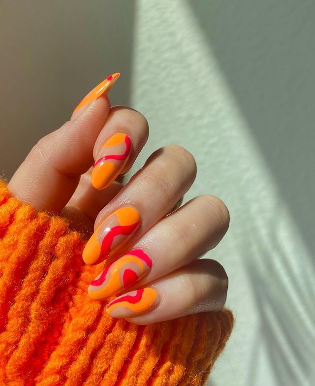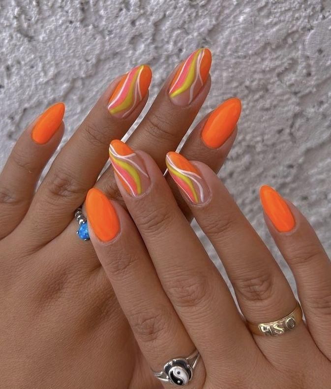 Lively orange nails mix with flowing yellow and pink swirls for a cheerful, beachy feel. The design looks artistic and energetic without being overwhelming.
