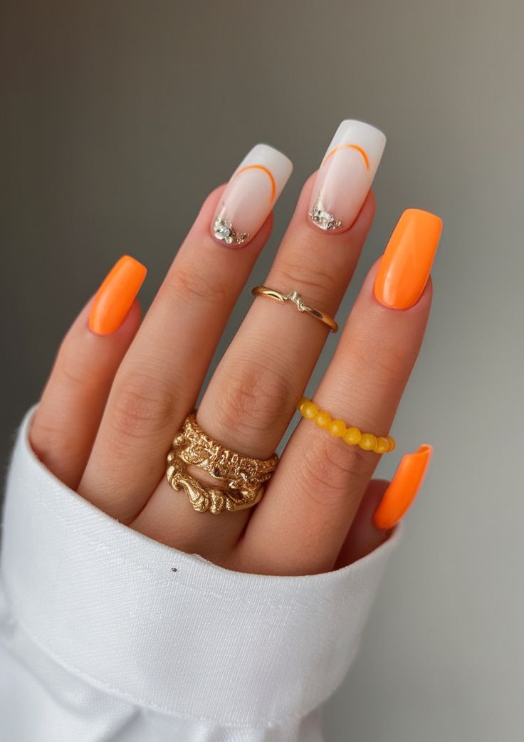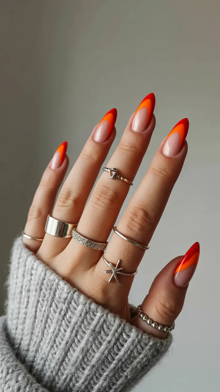 A striking mix of solid neon orange nails and subtle nude-based French tips with orange edges. The design is sleek, modern, and effortlessly eye-catching.