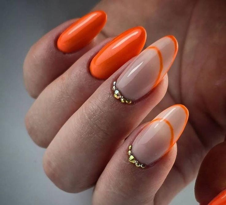 These almond nails blend vibrant orange with sheer nude accents and delicate rhinestone details. The curved lines give it a chic, glowing summer feel.