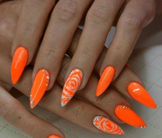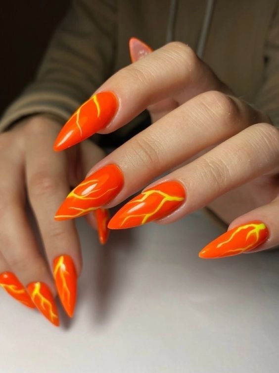 Long, stiletto-shaped nails in vivid orange are elevated with subtle flame-like detailing. The look is fiery, edgy, and full of hot summer energy.
