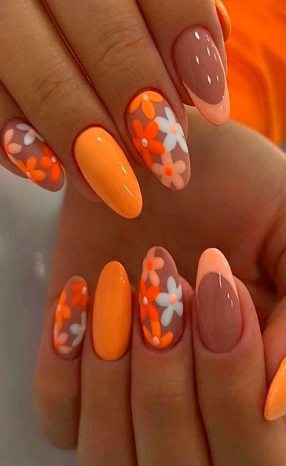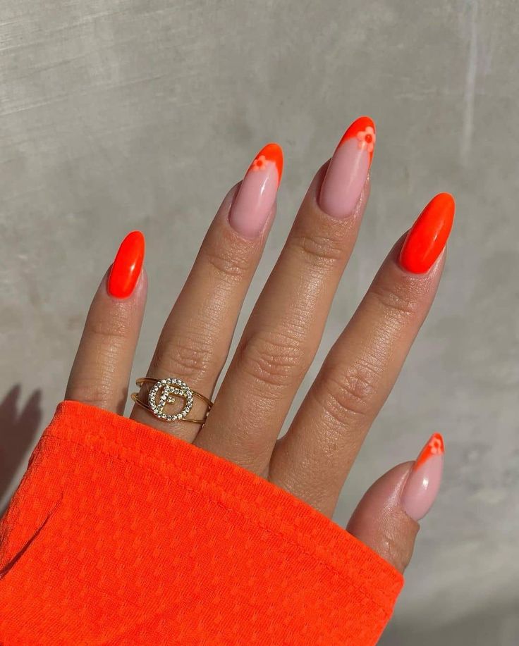 Bright orange nails are combined with sheer nude bases and daisy-style floral art in orange and white. The vibe is cheerful, feminine, and slightly retro.
