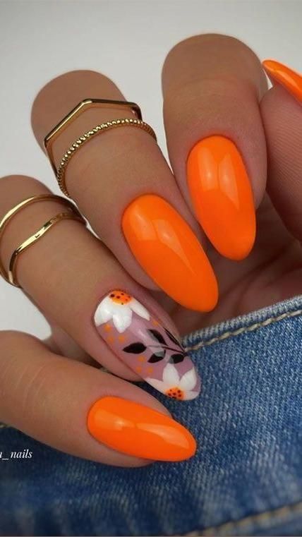 A vibrant neon orange manicure with a glossy finish and a soft nude accent nail featuring delicate white floral details. It’s fresh, bold, and perfect for a fun summer statement.