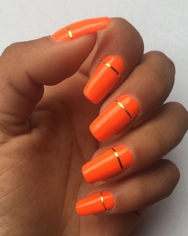 This bright orange manicure is elevated with thin gold stripe accents across each nail for a sleek, modern touch. It feels bold yet classy, like a chic summer sunset.