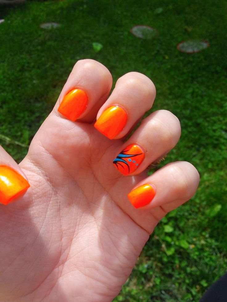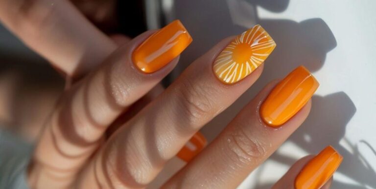 Bright orange nails are paired with a playful accent design that adds a fun, artistic twist. The look feels fresh, youthful, and energetic, like a pop of citrus in the sunshine.