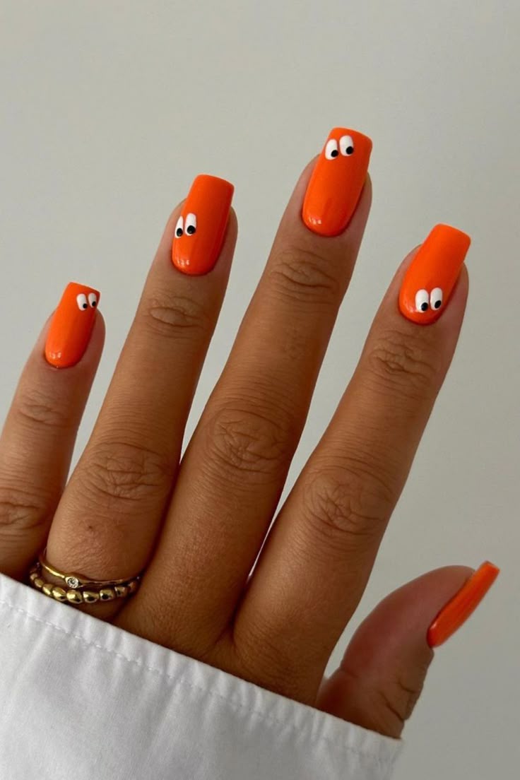 Bright neon orange nails are topped with tiny cartoon-style eyes for a quirky twist. The overall look is bold, fun, and full of personality.