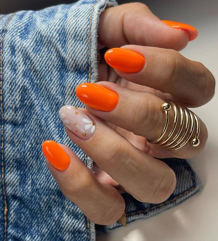 This design combines solid orange nails with a soft floral accent on a nude base. It gives off a cheerful, summery vibe that feels both cute and stylish.