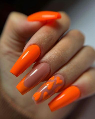 Long bright orange nails with a soft nude accent nail decorated in raised orange heart details. It’s flirty, glossy, and full of sweet summer energy.