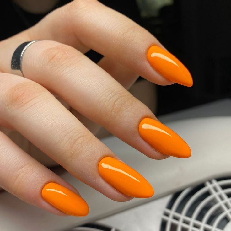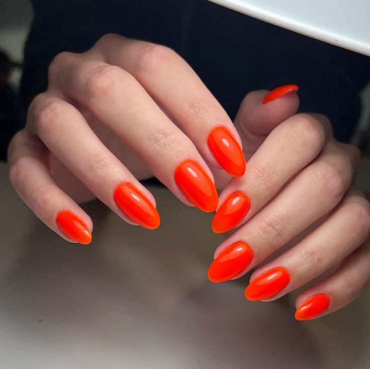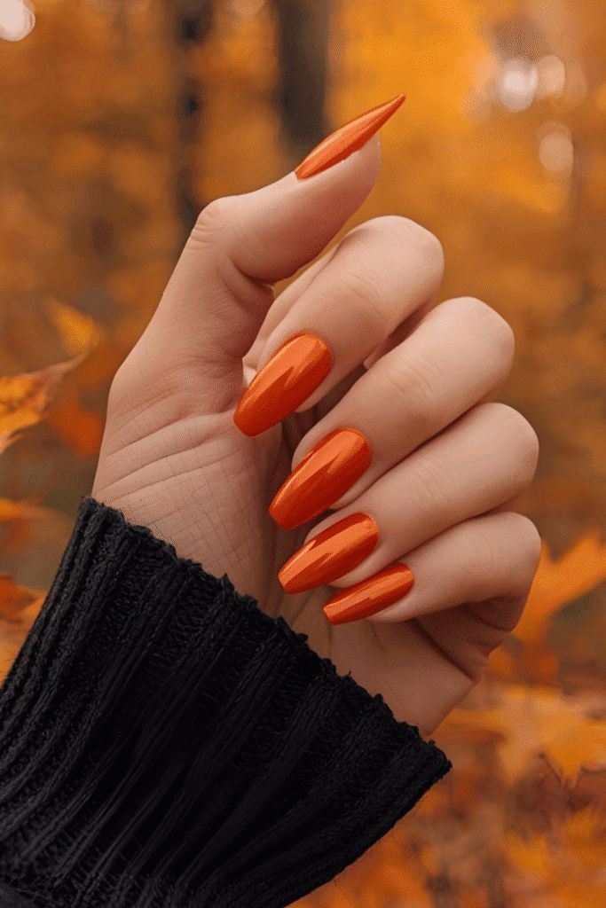 A rich, glossy orange manicure in a sleek almond shape with a smooth, high-shine finish. The warm tone gives off cozy sunset vibes while still feeling bold and summery.