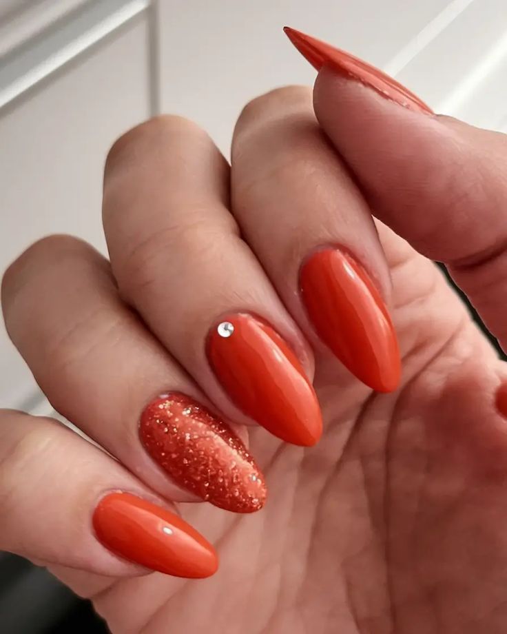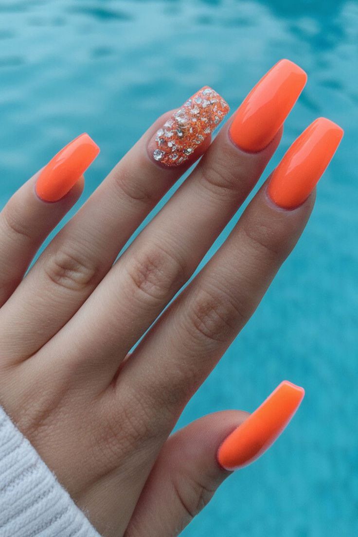 Bright orange nails are paired with a glittery accent nail for a touch of sparkle. The mix keeps the design lively, playful, and perfect for poolside days.
