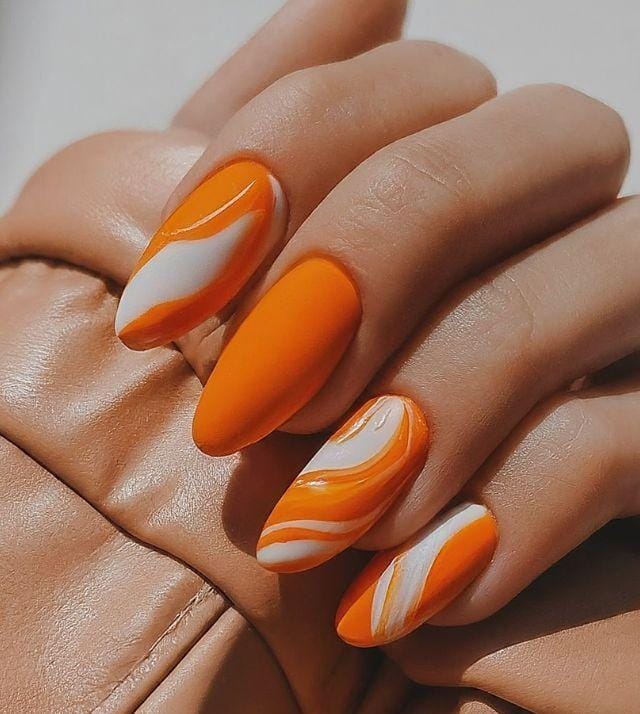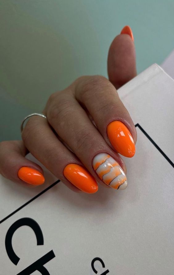Bold orange nails are balanced with a single accent nail featuring soft white and orange wave patterns. It has a clean, modern vibe with a subtle artistic twist.