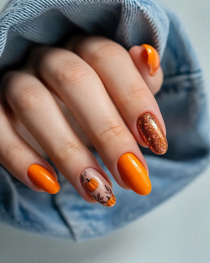 Bright orange nails are mixed with glitter accents and subtle pumpkin art for a fun seasonal twist. The overall vibe is warm, playful, and full of summer-to-fall energy.