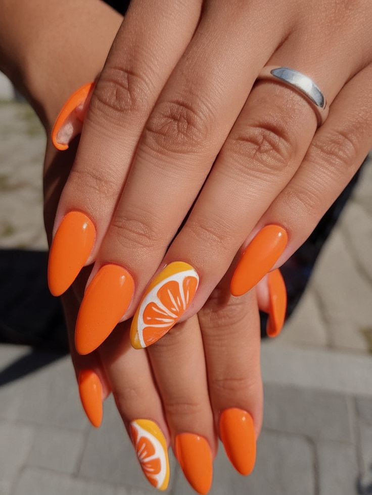 Bright orange almond nails feel fresh and summery, with a playful citrus slice accent adding a fun, juicy vibe. The glossy finish keeps the look bold yet clean.