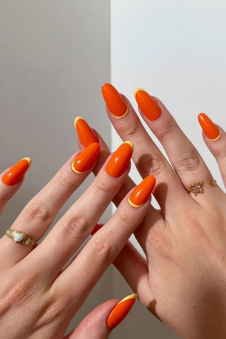 Vibrant orange nails are paired with soft yellow French tips for a warm, sun-kissed look. The design feels simple, modern, and perfect for summer days.