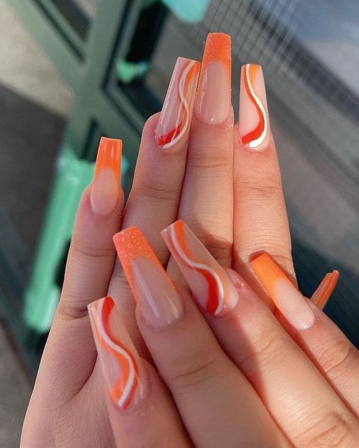 Clear and orange nails feature soft, wavy lines that resemble a glowing summer sunset. The mix of transparency and color gives it a trendy, airy vibe.