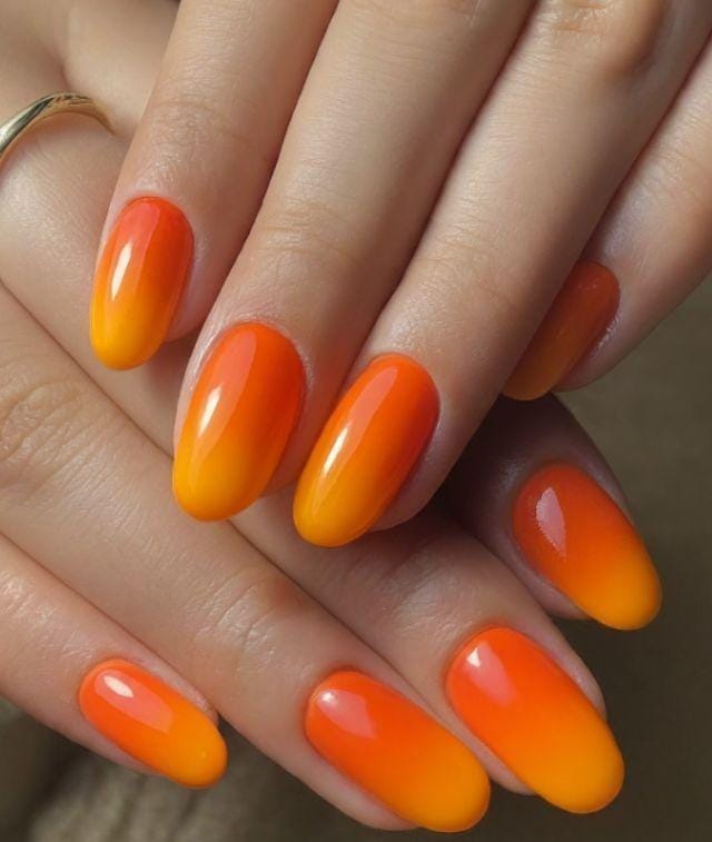 A smooth orange-to-yellow ombré creates a warm, radiant finish across the nails. The look is sleek, glossy, and effortlessly summery.