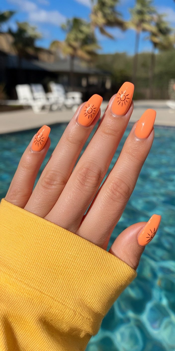 These nails feature a soft, bright orange base with tiny sun accents that give off an easy, beach-day vibe. The look feels playful, warm, and perfect for summer holidays.