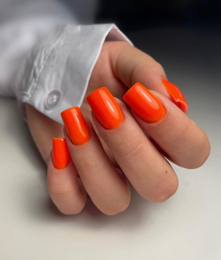 This design uses a vivid orange shade on square-shaped nails for a modern, polished feel. The high-shine finish keeps it sleek while still feeling fun and seasonal.