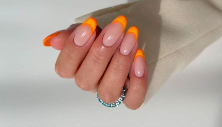 A vibrant neon orange pairs with soft pink nude bases in a playful French tip style. The look feels fresh, minimal, and perfect for sunny summer days.