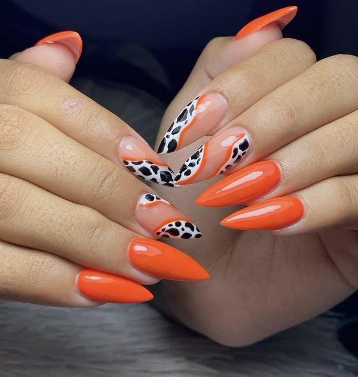 This look combines bright orange nails with abstract animal-print accents for a bold, trendy vibe. It feels confident, stylish, and made for summer statement looks.