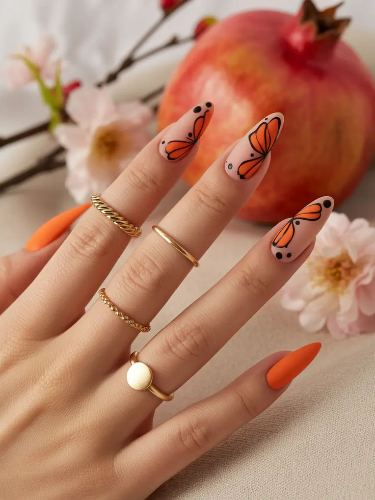 These bright orange almond nails mix solid color with delicate butterfly accents for a playful, summery look. The design feels fresh and feminine with a soft, nature-inspired vibe.