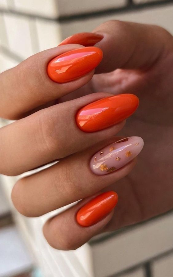 This set features bold, high-shine orange nails paired with a soft nude accent touched with gold foil. It’s sleek, vibrant, and perfect for a chic summer statement.