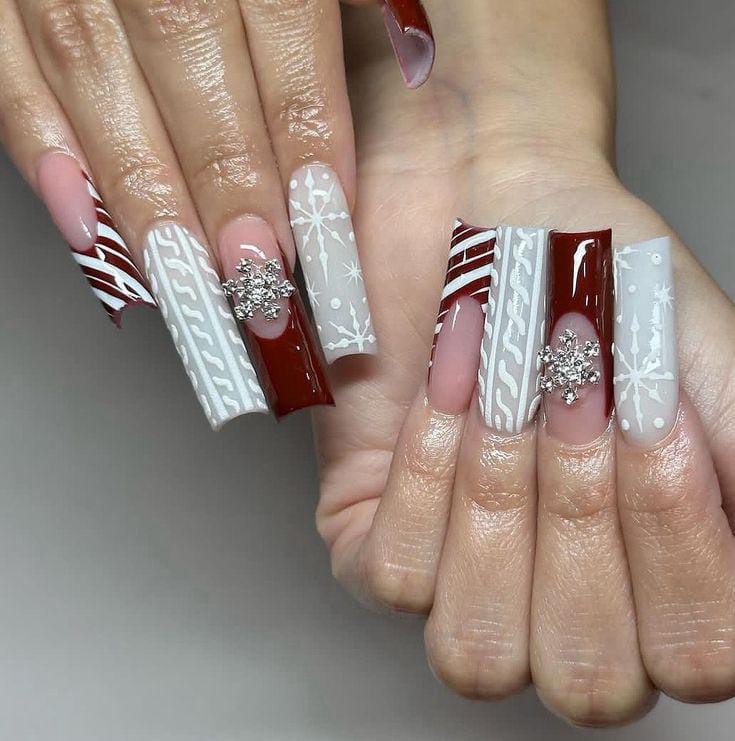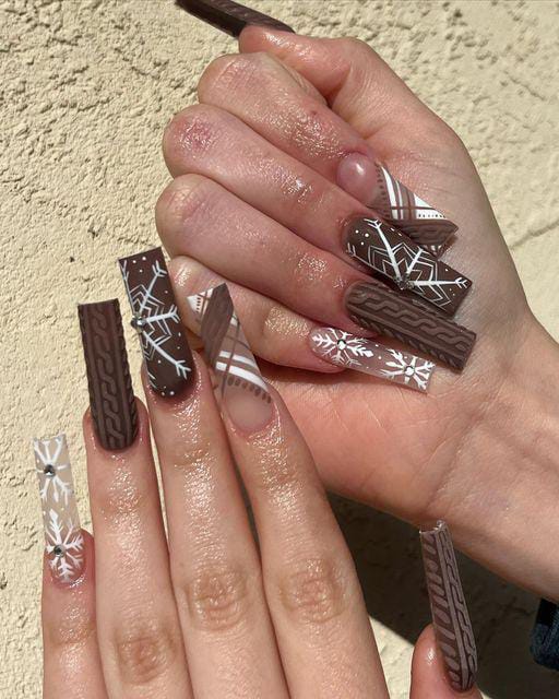 This set blends deep chocolate brown with winter-white snowflakes, plaid-like designs and sweater textures, creating a rustic, cold-weather charm. The long square tips make the mix of patterns feel modern and playful.