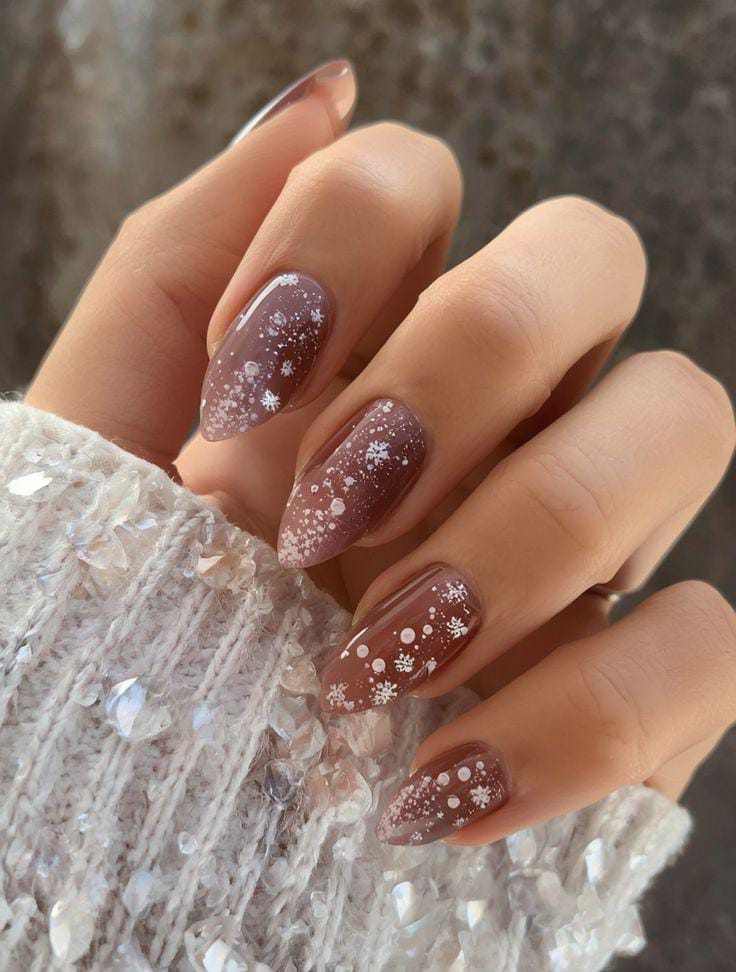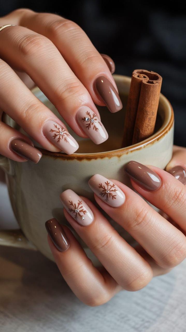 Soft nude-brown tones pair with deep shimmery brown accents and subtle white snowflakes along the tips. It feels simple, elegant, and perfect for a cozy winter look.