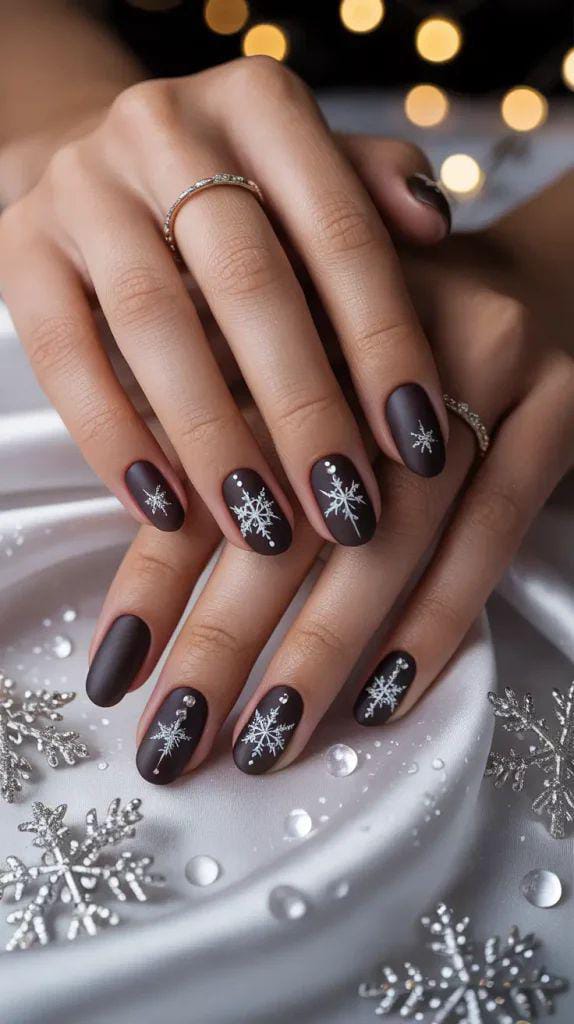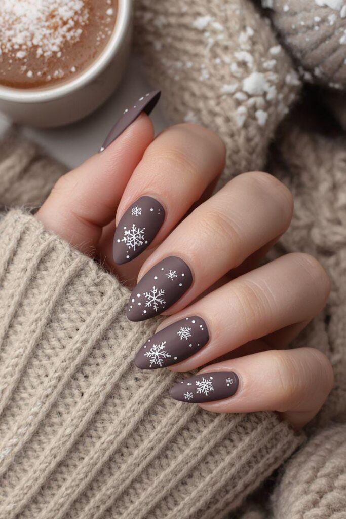 These matte chocolate-brown nails are decorated with crisp white snowflakes and tiny dots, creating a clean and modern winter aesthetic. The matte finish adds a soft, velvety touch.