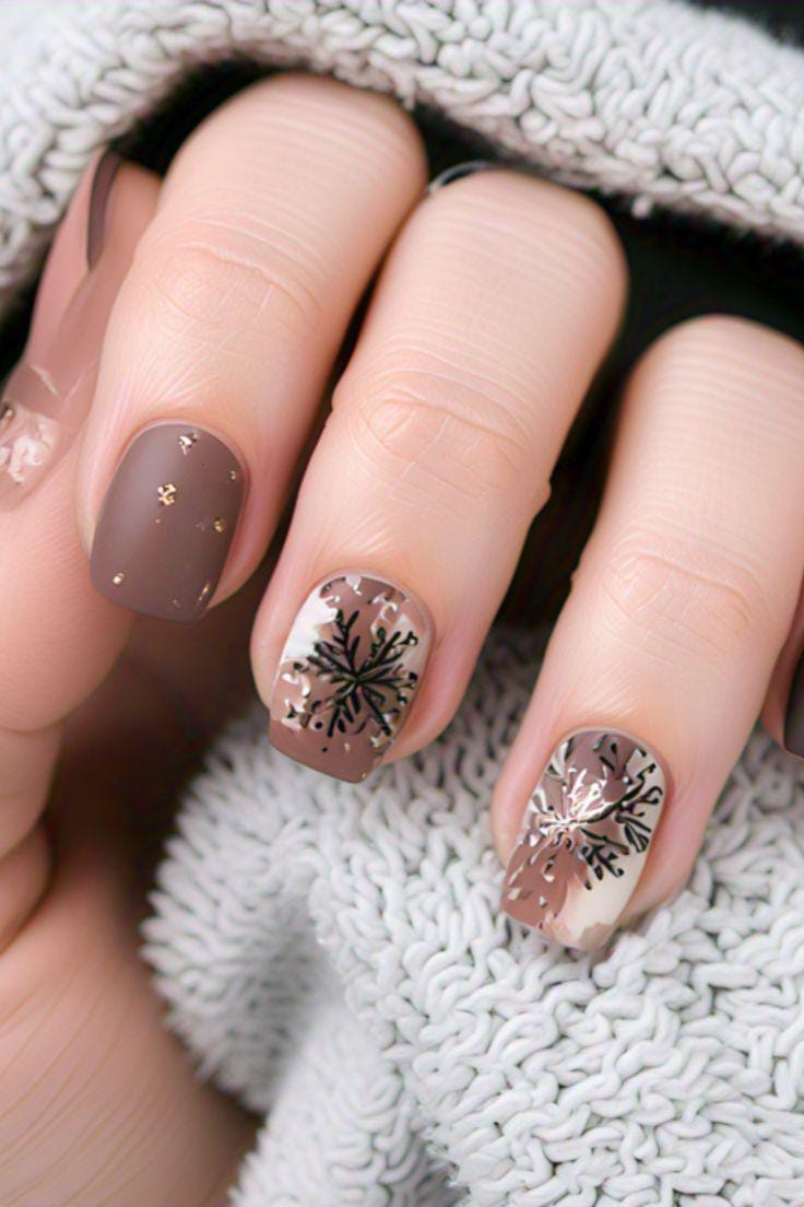 Short, square nails in muted brown shades blend with soft gradients and black snowflake art for a cozy, textured winter look. Small metallic accents give the design a gentle shimmer.