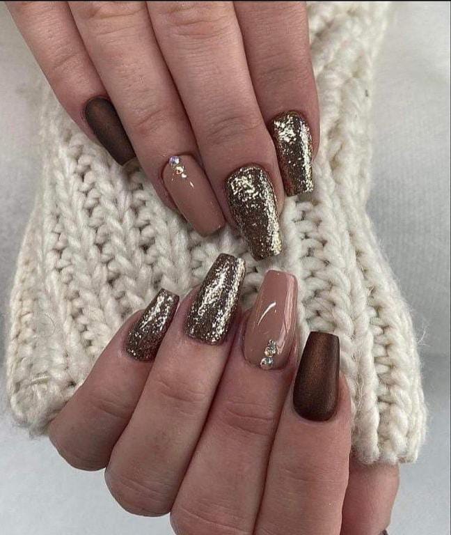 Soft nude and deep brown nails are paired with heavy gold glitter, giving a festive yet classy winter finish. The mix of matte and glossy textures adds a chic, polished feel.