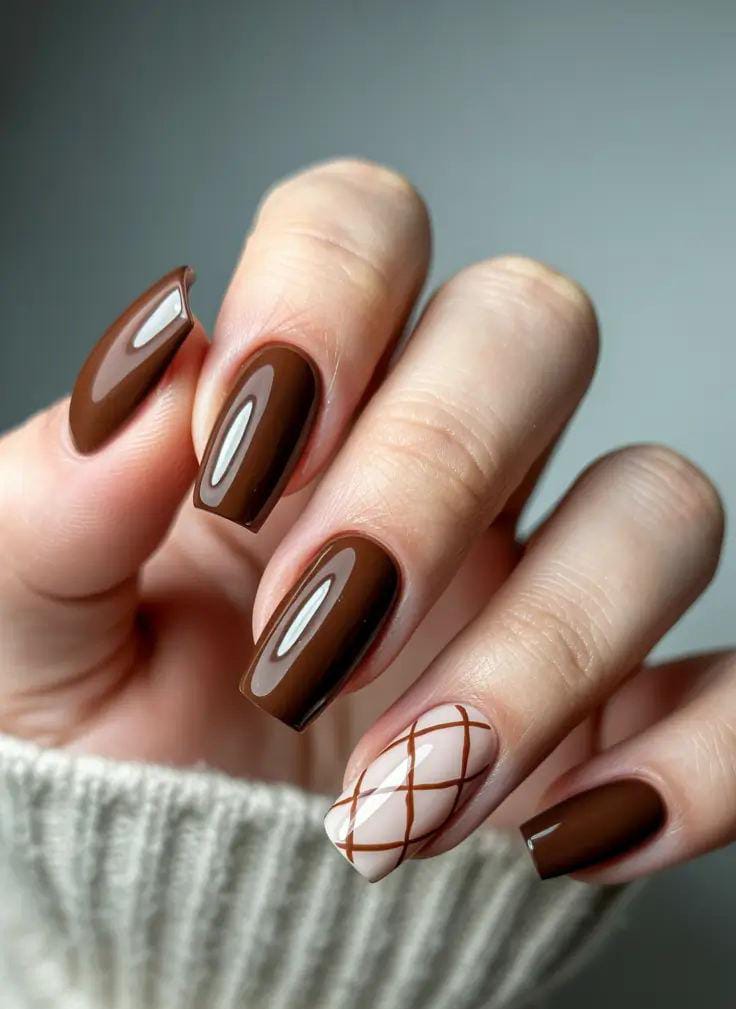 A simple yet polished look, these glossy mocha nails are paired with one soft nude accent nail lined with a clean brown crisscross pattern. It’s understated, smooth, and perfect for a warm winter vibe.