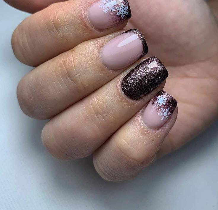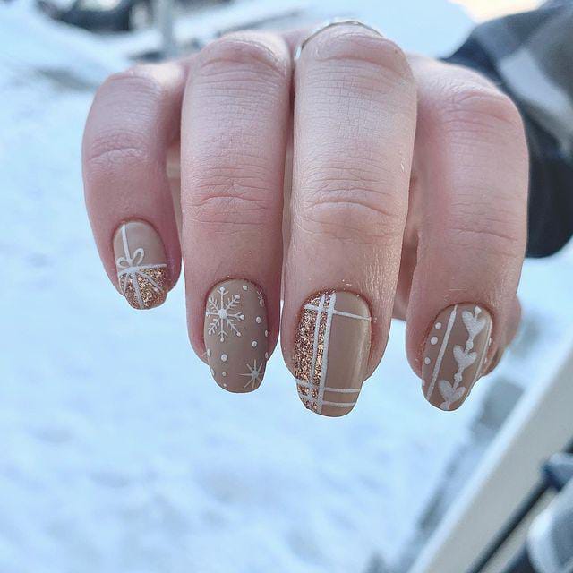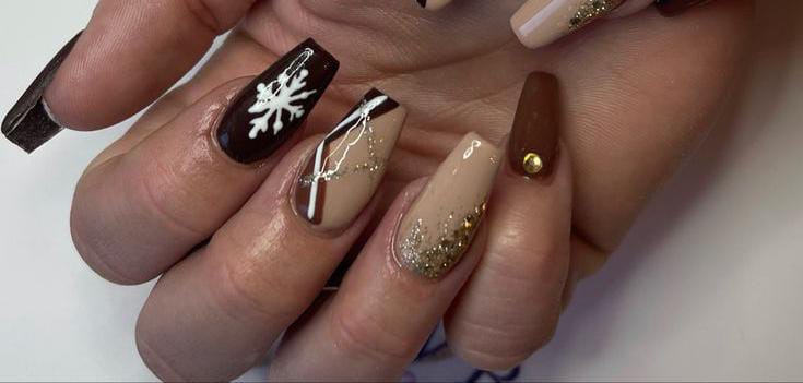 A mix of brown, beige, and gold glitter is topped with delicate winter accents like snowflakes and fine line art. It blends cozy winter tones with a touch of holiday sparkle.