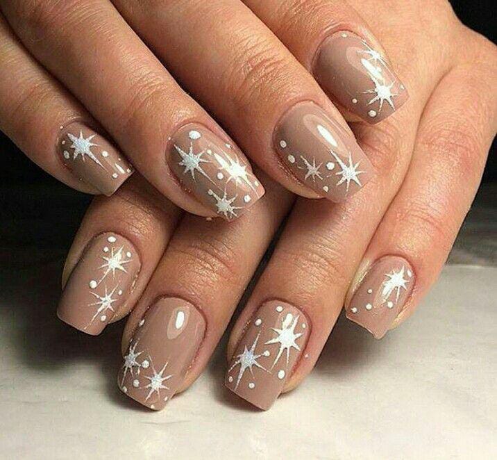 This design features a soft taupe-brown base decorated with white starbursts and tiny dots, giving the nails a dreamy, frosted-night-sky look. The overall vibe is delicate, cozy, and wintery without being too bold.