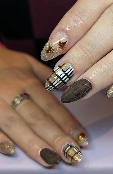 A mix of chocolate browns, gold foil accents, and a bold white-and-black plaid nail creates a warm, rustic winter feel. The combination of textures and patterns gives it a stylish, sweater-weather aesthetic.
