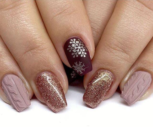 A blend of rose-brown matte sweater textures, sparkling gold glitter, and a deep mulberry accent nail topped with snowflakes creates a festive yet soft winter vibe.
