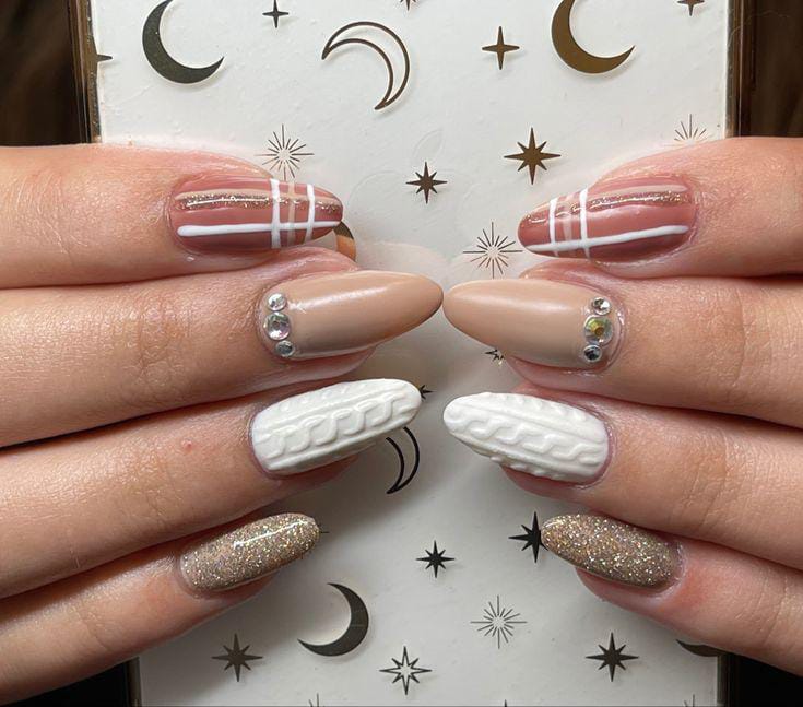 This design mixes nude and brown tones with white sweater-knit textures, minimal line art, and glittery gold nails for a chic winter-cozy look. The added rhinestones give it a soft touch of elegance.