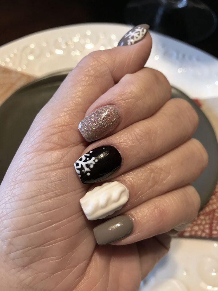 This design blends warm brown tones with a glitter accent, a soft sweater-texture nail, and a bold snowflake on glossy black, giving it a cozy yet stylish winter feel.