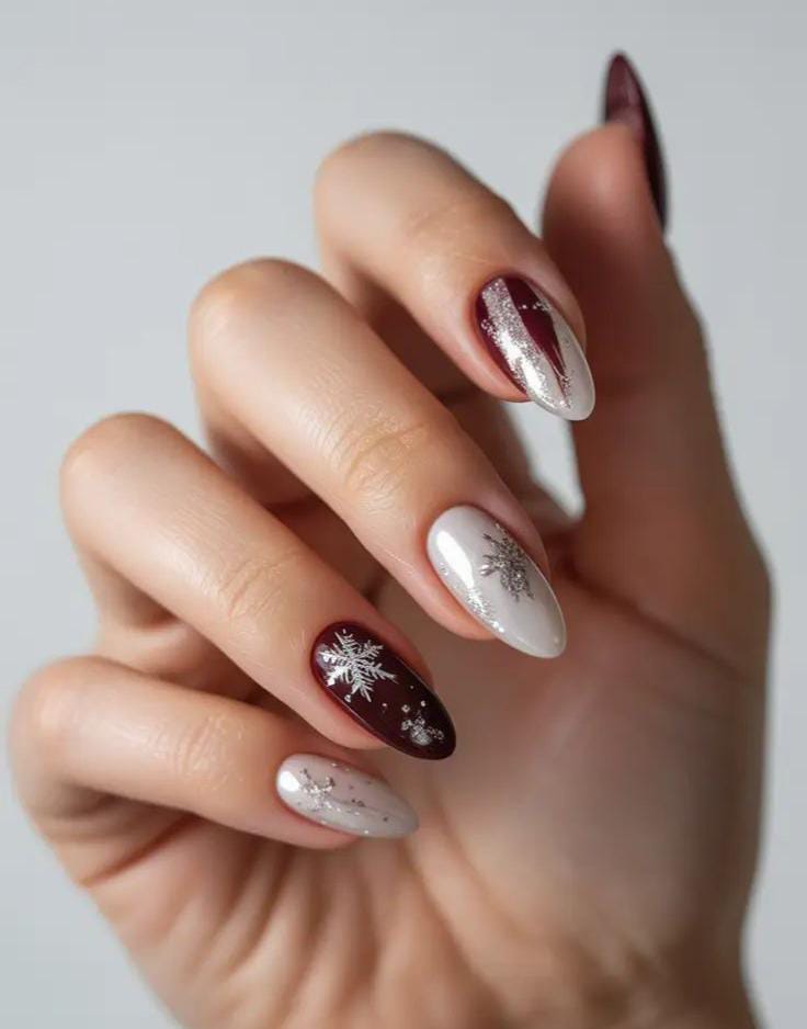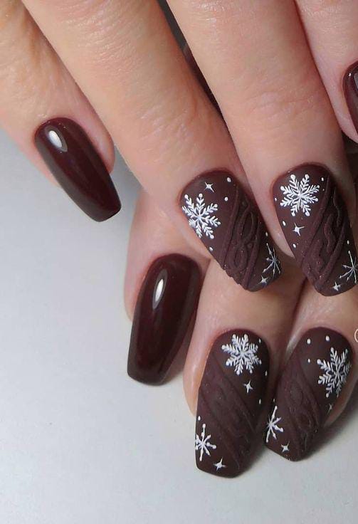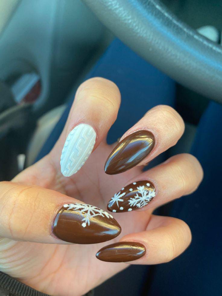 Rich chocolate-brown nails are paired with crisp white sweater detailing and delicate snowflakes, creating a festive look that’s both elegant and wintry.