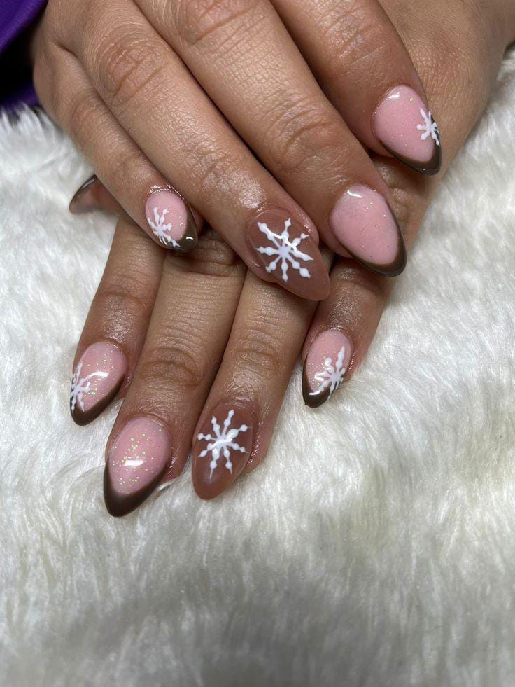 These nails feature soft pink bases with deep brown French tips and bold white snowflakes, offering a subtle winter twist with a clean, feminine vibe.