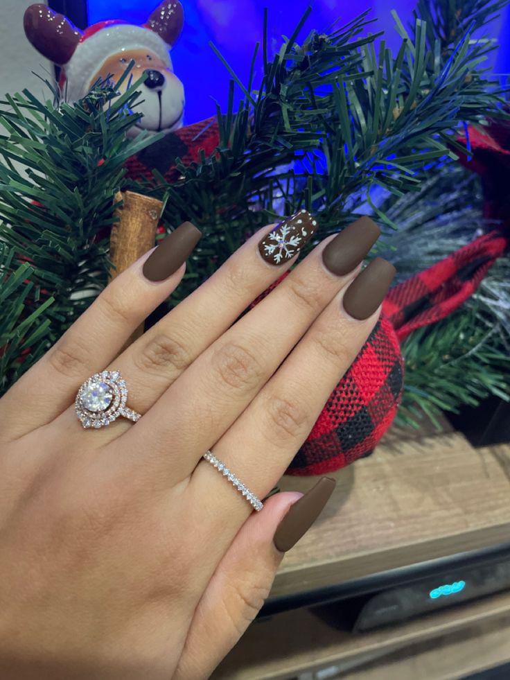 A deep matte-brown set accented with a single glossy snowflake nail strikes a chic balance between minimalism and festive holiday charm.