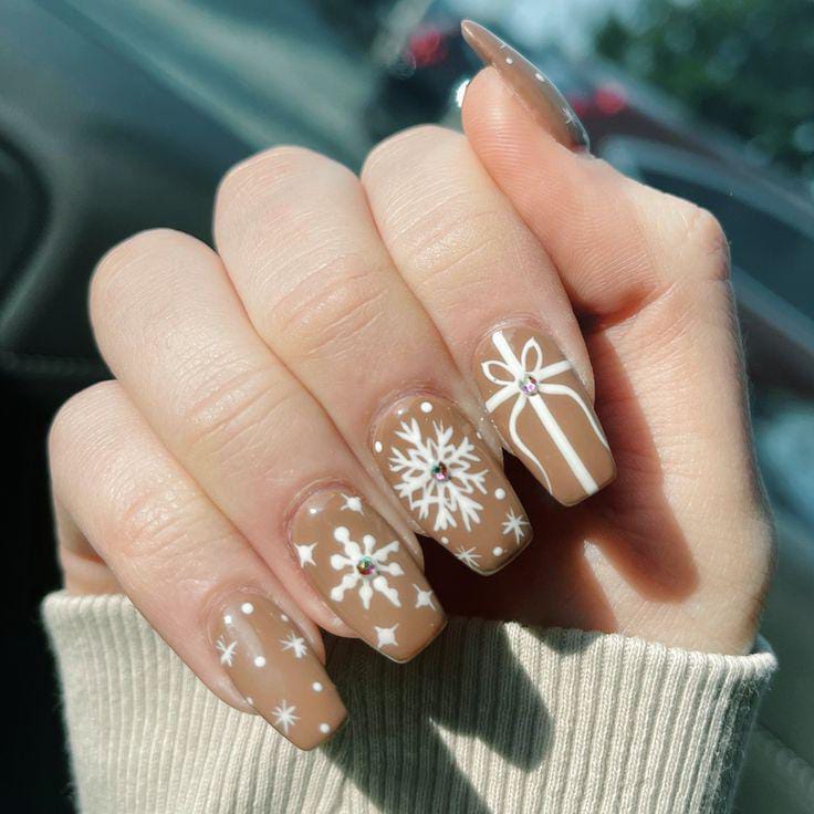 Light caramel-brown nails decorated with white snowflakes, tiny dots, and a cute gift-box design create a sweet, playful winter look.
