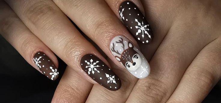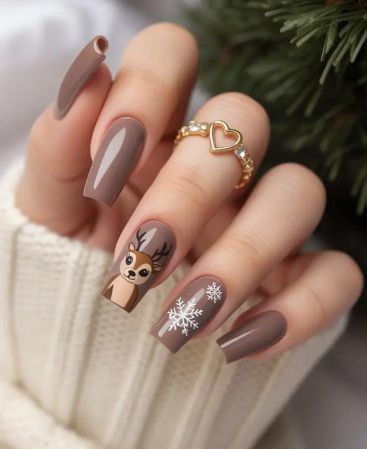 Soft taupe-brown nails paired with a cute reindeer accent and delicate white snowflakes give this set a playful, cozy holiday vibe.