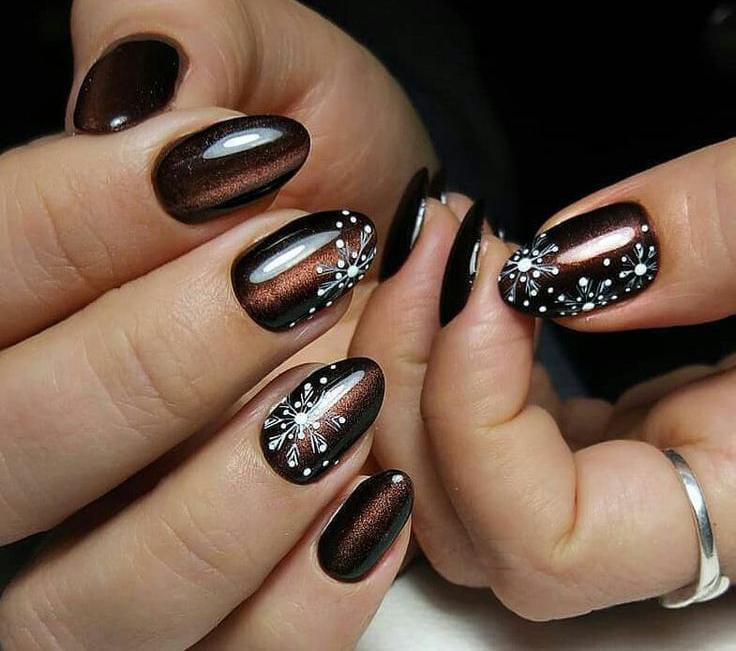 Rich, shimmery brown nails are highlighted with delicate white snowflake accents, blending a luxurious metallic finish with classic winter patterns.