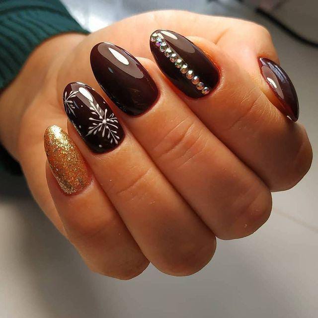 Rich brown and burgundy tones pair with shimmering accent nails and crystal embellishments for a luxurious winter look. The combination feels both glam and seasonally warm.