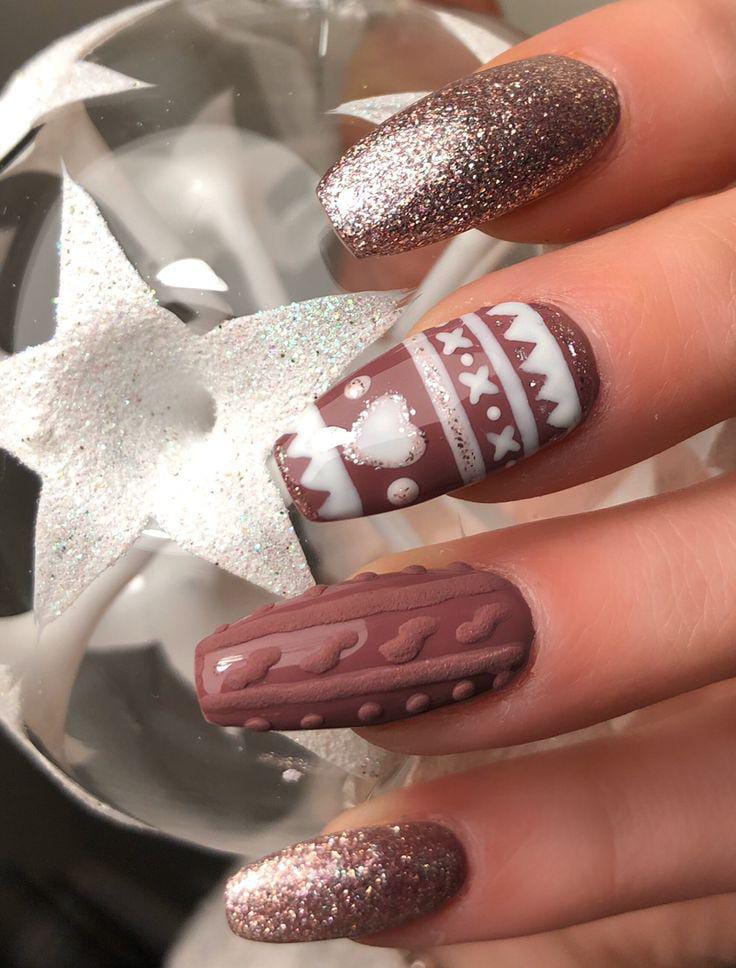 This look combines glittery rose-gold accents with brown sweater-textured patterns and Nordic-inspired designs, giving the nails a snug, winter-knit aesthetic.